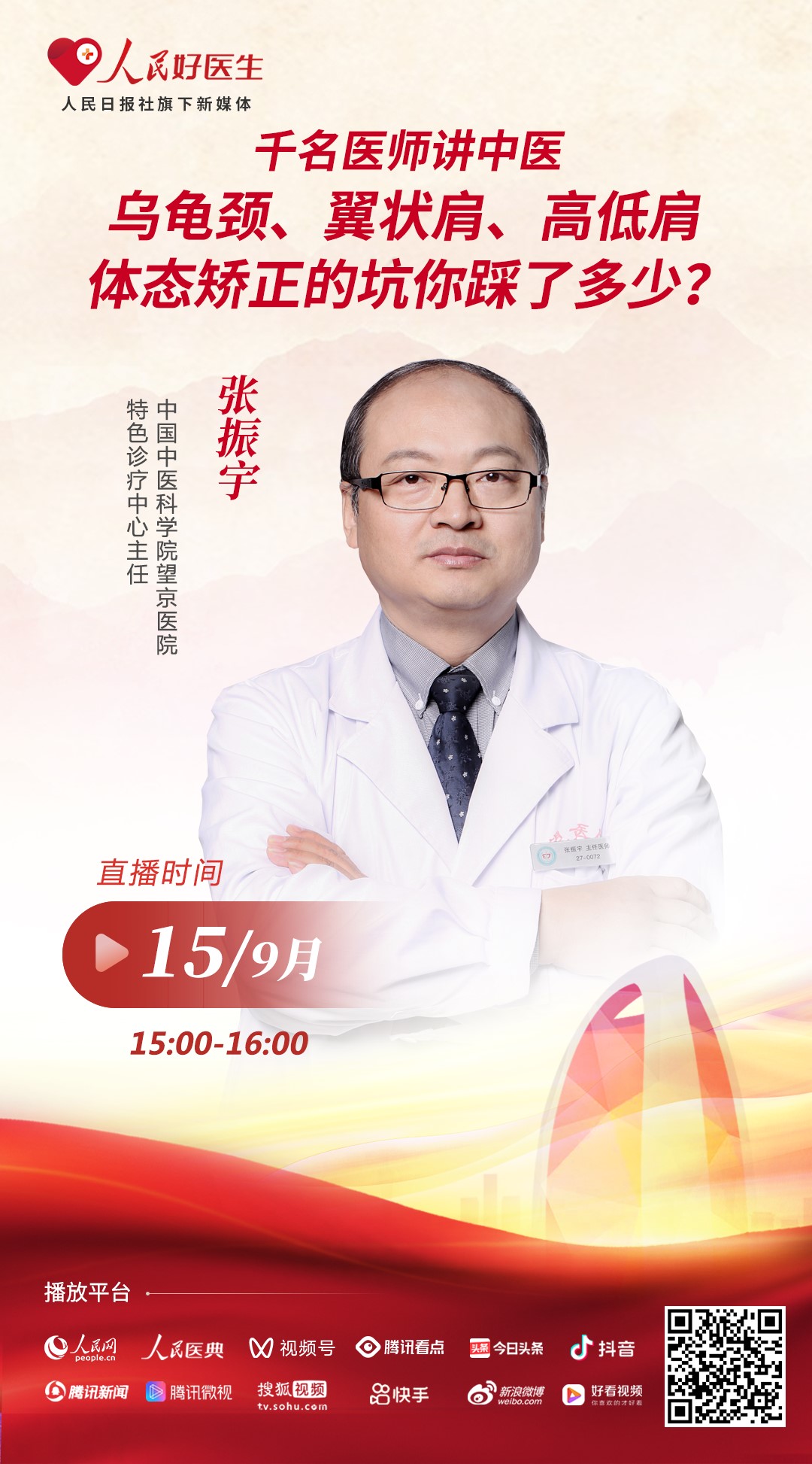 9月15日15:00-16:00,人民日報社旗下新媒體平臺“人民好醫生”與國家中醫藥管理局辦公室聯合推出的“千名醫師講中醫”系列直播將邀請中國中醫科學院望京醫院特色診療中心主任張振宇做客直播間,為大眾詳細科普體態矯正的正確做法。