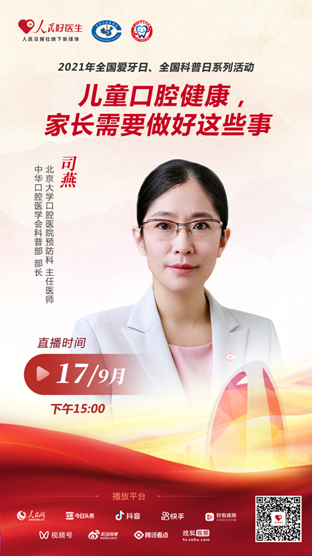 9月17日15:00—16:00,我們將邀請北京大學口腔醫院預防科主任醫師、中華口腔醫學會科普部部長司燕做客人民好醫生名醫直播欄目,給大家科普關注兒童口腔健康問題,作為家長需要做好的那些事。