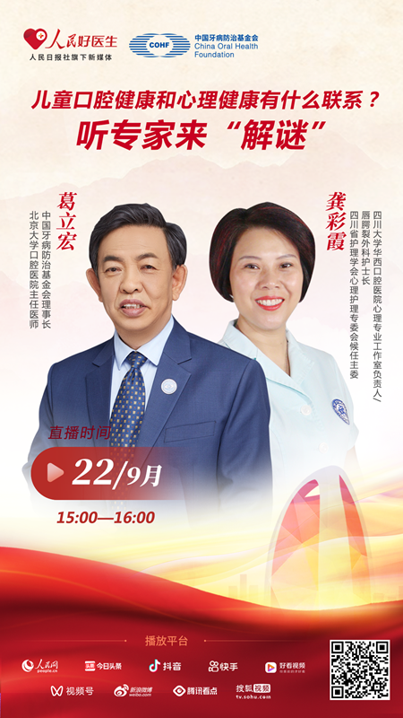 9月22日15:00至16:00,中國牙病防治基金會理事長、北京大學口腔醫院主任醫師葛立宏,四川大學華西口腔醫院心理專業工作室負責人/唇腭裂外科護士長、國家二級心理咨詢師、心理督導師、四川省護理學會心理護理專委會候任主委龔彩霞將做客“人民好醫生”APP直播間,為大眾科普兒童口腔健康和心理健康的相關常識。歡迎屆時收看。