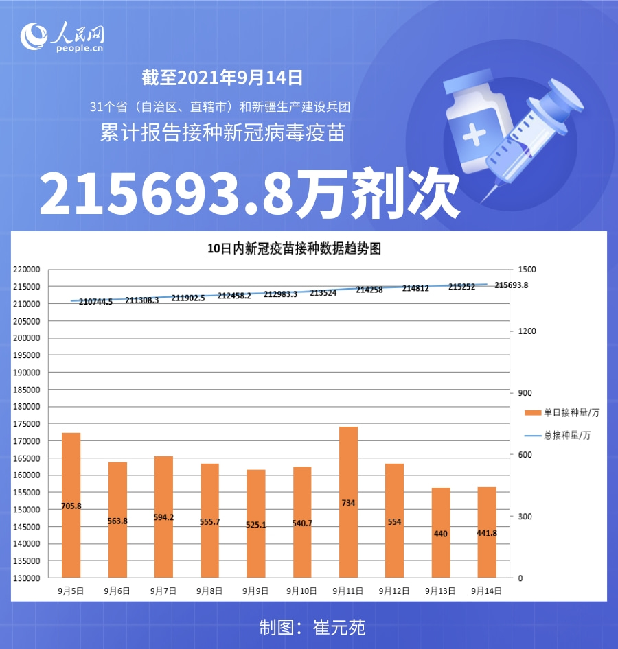 人民網(wǎng)北京9月15日電 (記者崔元苑)據(jù)國家衛(wèi)生健康委官網(wǎng)消息,截至2021年9月14日,31個省(自治區(qū)、直轄市)和新疆生產(chǎn)建設(shè)兵團(tuán)累計報告接種新冠病毒疫苗215693.8萬劑次。