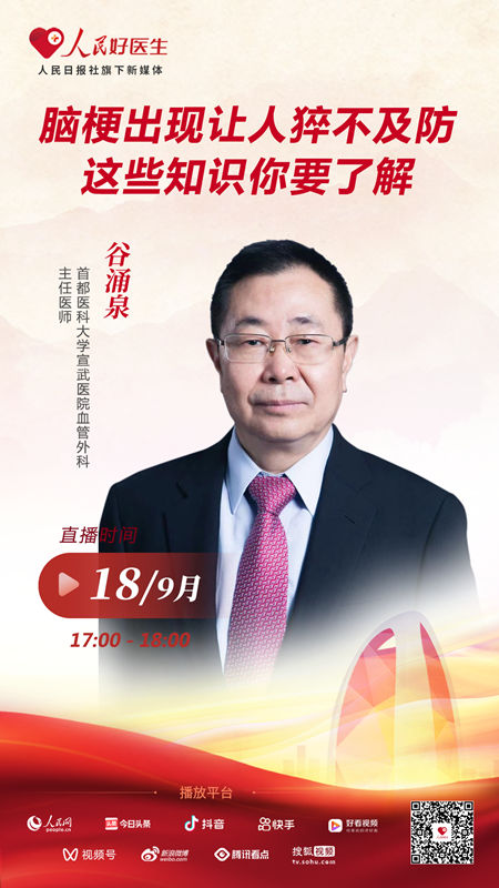9月18日17:00至18:00首都醫科大學宣武醫院血管外科主任醫師谷涌泉做客人民好醫生名醫直播欄目。給公眾科普腦梗知識,敬請期待。