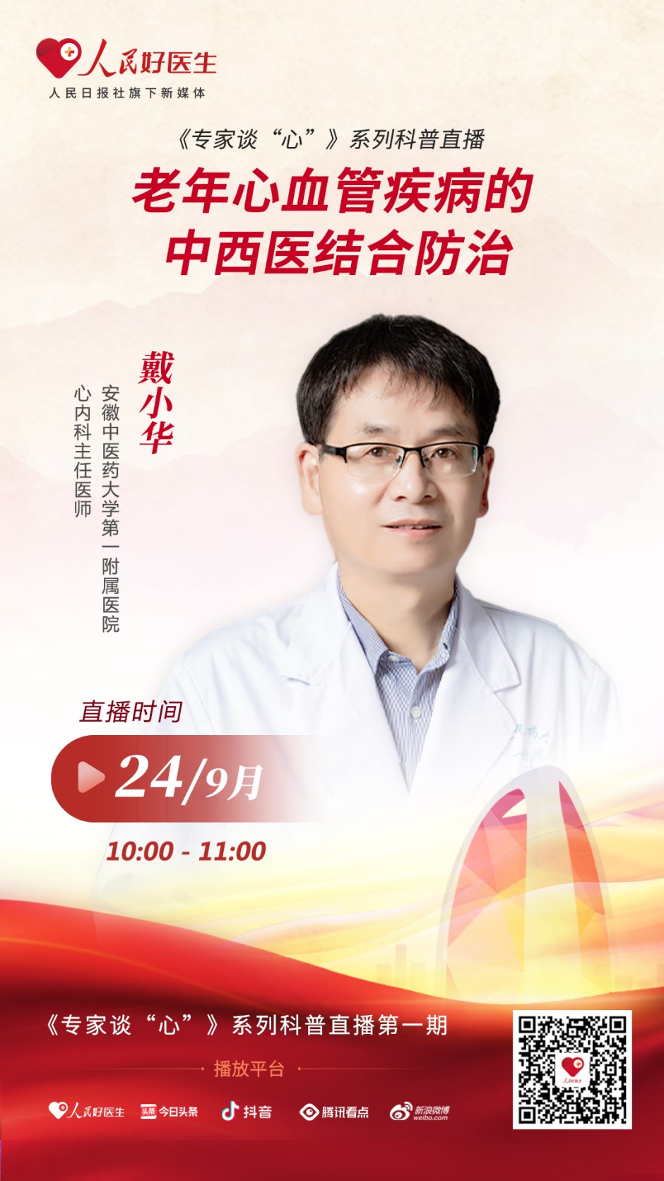 9月24日10:00-11:00,安徽中醫藥大學第一附屬醫院心內科主任醫師戴小華將做客“人民好醫生”APP直播間,為大眾科普老年心血管疾病的防治知識。歡迎屆時收看。
