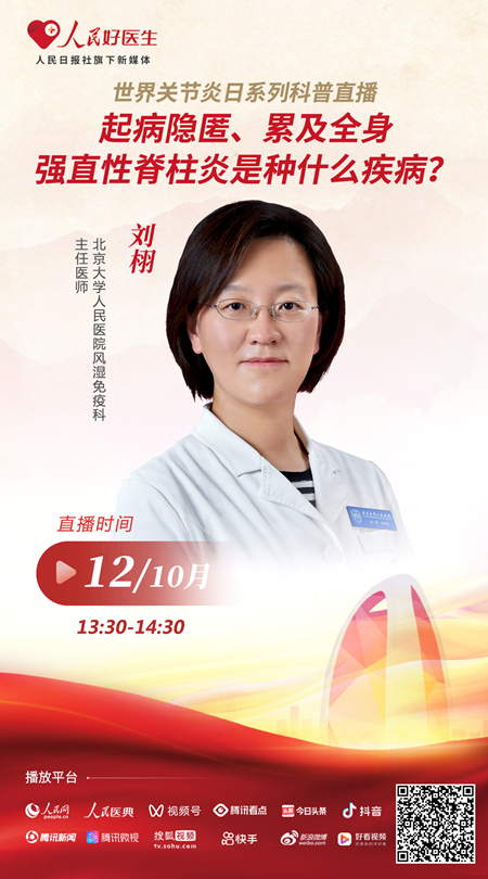 10月12日13:30至14:30,“人民好醫生”客戶端將邀請北京大學人民醫院風濕免疫科主任醫師劉栩進行視頻直播,為您科普強直性脊柱炎診療及日常護理的相關知識,千萬不要錯過。