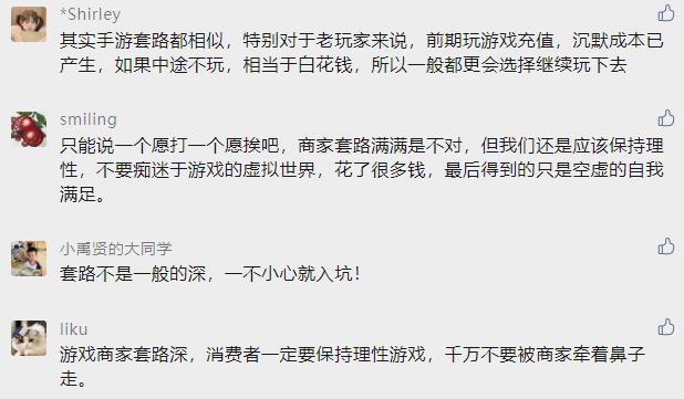 上海市消保委表示,事實上所有的手游都在竭盡全力營造代入感,通過強烈的代入感可以使玩家將游戲體驗誤做人生體驗,逐漸模糊游戲與現實的邊際,再通過人性在游戲中代入的舒適感、成長感、成就感、失敗感這四感形成消費閉環,并利用這些人性的弱點來謀利,這就是為什么這些套路能屢屢成功的原因。