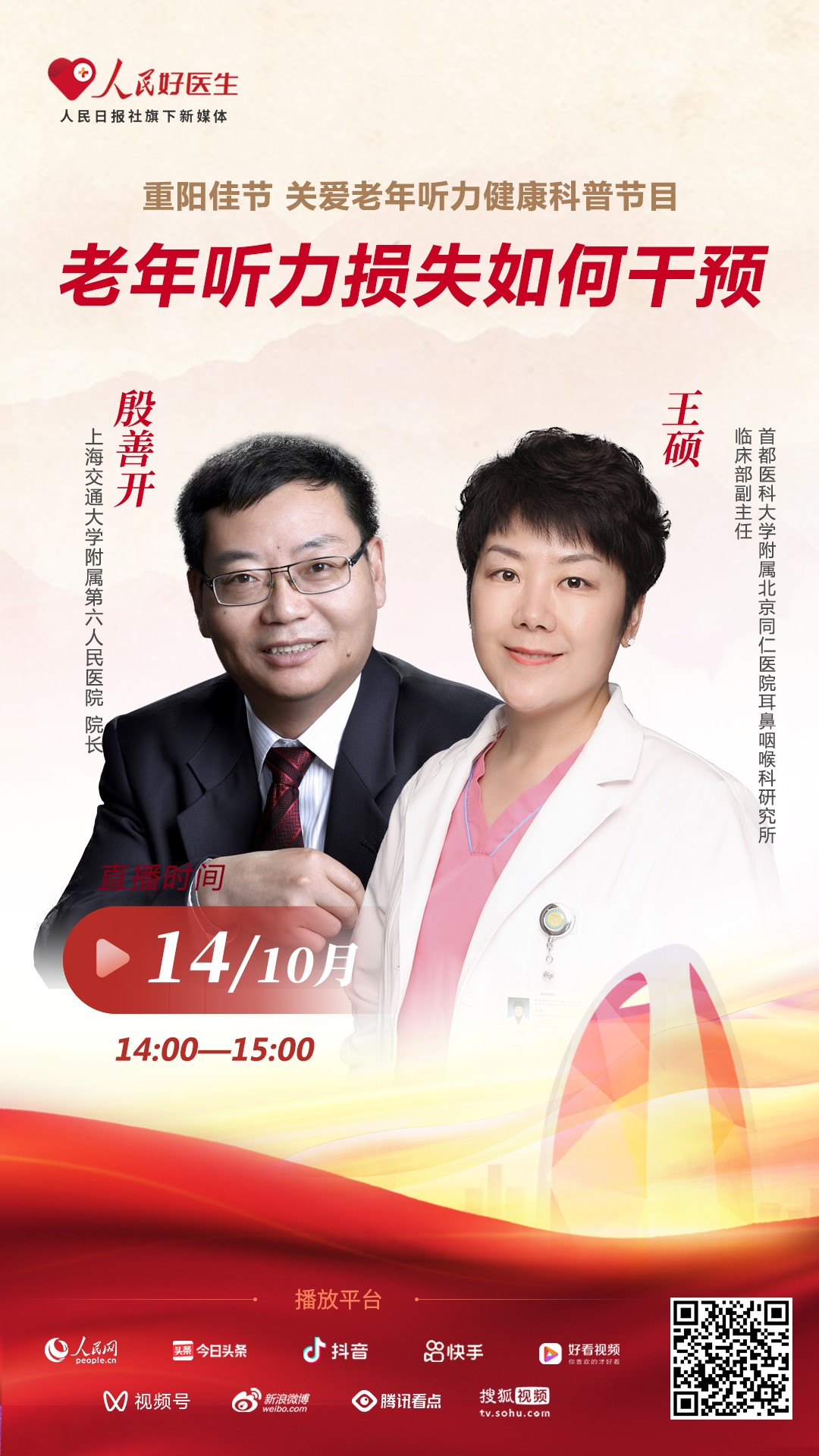 為提升大眾對耳與聽力健康知識的認知度,普及耳聾預防的康復知識,降低老年人發生聽力損失的風險,人民網·人民健康與全國防聾治聾技術指導組共同開展“重陽佳節 關愛老年聽力健康”系列科普節目。10月14日14:00,上海交通大學附屬第六人民醫院院長殷善開,首都醫科大學附屬北京同仁醫院耳鼻咽喉科研究所臨床部副主任王碩做客人民好醫生客戶端,科普老年聽力損失如何干預。