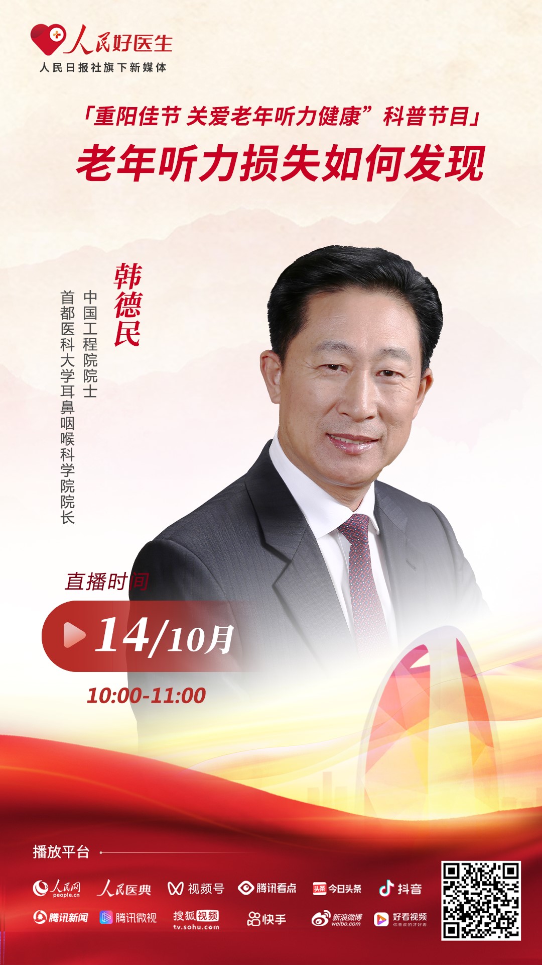 為提升大眾對(duì)耳與聽力健康知識(shí)的認(rèn)知度,普及耳聾預(yù)防的康復(fù)知識(shí),降低老年人發(fā)生聽力損失的風(fēng)險(xiǎn),人民網(wǎng)·人民健康與全國(guó)防聾治聾技術(shù)指導(dǎo)組共同開展“重陽佳節(jié) 關(guān)愛老年聽力健康”系列科普節(jié)目。10月14日10:00,“人民好醫(yī)生”客戶端將邀請(qǐng)中國(guó)工程院院士韓德民進(jìn)行視頻直播,為您科普老年聽力損失的相關(guān)知識(shí),千萬不要錯(cuò)過。