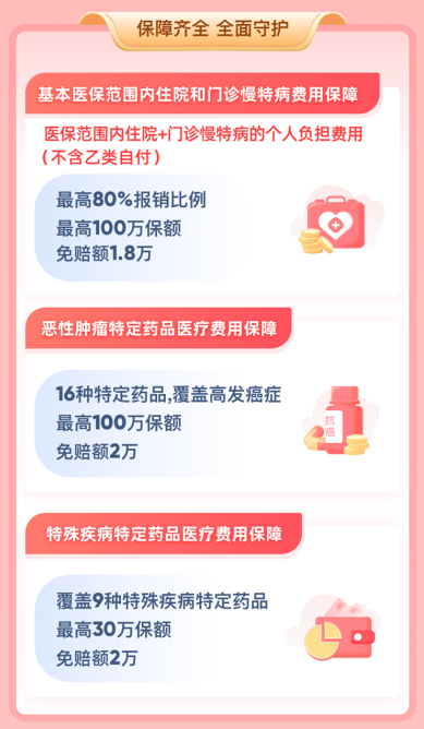在報銷比例上,基本醫保范圍內住院、門診慢特病費用保障免賠額為1.8萬元,非既往癥人員賠付比例為80%,既往癥人員為30%;