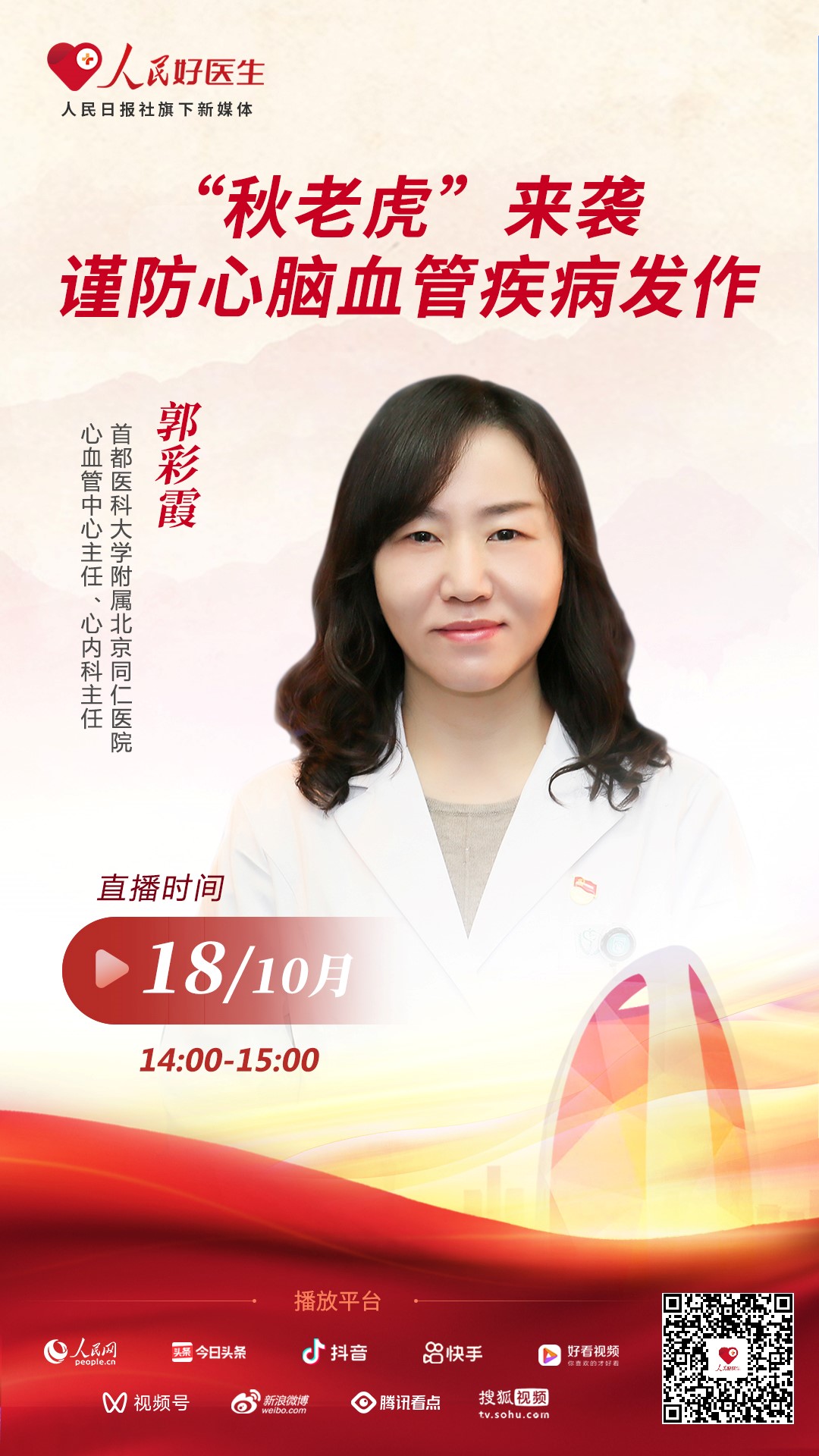 “秋老虎”是指立秋后短時(shí)間的天氣回?zé)岈F(xiàn)象,氣溫波動(dòng)較大,心血管疾病患者病情容易出現(xiàn)反復(fù)、甚至加重。10月18日14:00-15:00,人民日?qǐng)?bào)社旗下新媒體平臺(tái)“人民好醫(yī)生”將邀請(qǐng)首都醫(yī)科大學(xué)附屬北京同仁醫(yī)院心血管中心主任、心內(nèi)科主任,主任醫(yī)師郭彩霞做客直播間,與大家分享心腦血管方面疾病及相關(guān)預(yù)防、治療科普知識(shí)。