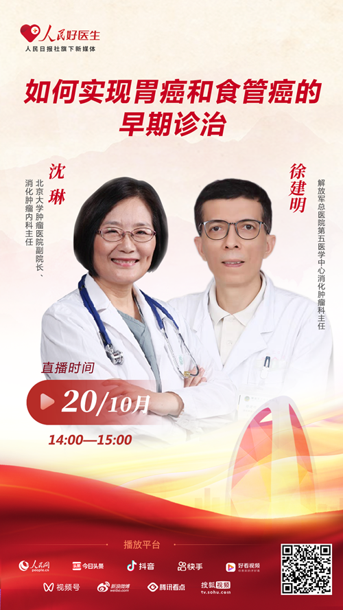 10月20日14:00,北京大學腫瘤醫院副院長、消化腫瘤內科主任沈琳;解放軍總醫院第五醫學中心消化腫瘤科主任徐建明做客人民好醫生客戶端,給大家帶來胃癌和食管癌早期診治建議。