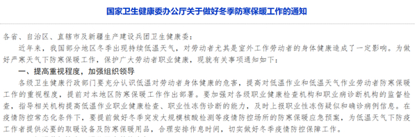 人民網北京10月19日電 (記者張文婷)近年來,我國部分地區冬季出現持續低溫天氣,對勞動者尤其是室外工作勞動者的身體健康造成了一定影響。為做好嚴寒天氣下防寒保暖工作,保護廣大勞動者職業健康,近日,國家衛生健康委辦公廳印發了《國家衛生健康委辦公廳關于做好冬季防寒保暖工作的通知》(以下簡稱《通知》),從加強組織領導、監督檢查和宣傳教育三個方面提出了具體要求。