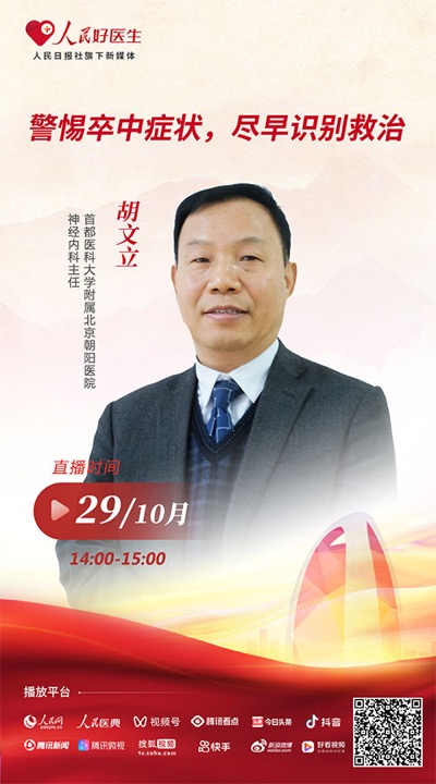10月29日14:00-15:00,“人民好醫生”客戶端將邀請首都醫科大學附屬北京朝陽醫院神經內科主任胡文立進行視頻直播,和我們一起聊一聊腦卒中的防治,千萬不要錯過。