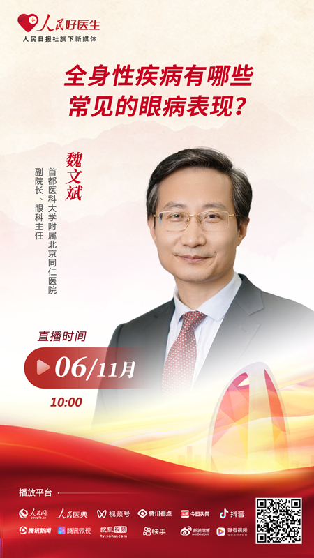 11月6日10:00至11:00,人民日報社旗下新媒體客戶端“人民好醫生”將邀請首都醫科大學附屬北京同仁醫院副院長、眼科主任魏文斌做客直播間,和大家一起關注全身性疾病與眼病的關系,歡迎大家收看。
