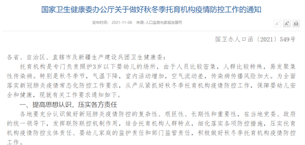 人民網(wǎng)北京11月9日電 (記者張文婷)為全面落實新冠肺炎疫情常態(tài)化防控工作要求,近日,國家衛(wèi)生健康委辦公廳發(fā)布《關(guān)于做好秋冬季托育機構(gòu)疫情防控工作的通知》(以下簡稱《通知》),要求從嚴(yán)從緊抓好秋冬季托育機構(gòu)疫情防控工作,保障嬰幼兒安全和健康。