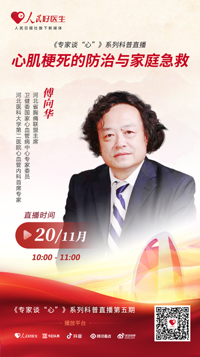11月20日10:00-11:00,“人民好醫(yī)生”客戶端將邀請河北省胸痛聯(lián)盟主席、河北醫(yī)科大學第二醫(yī)院心血管內科首席專家傅向華進行視頻直播,為您科普心肌梗死的防治與家庭急救的相關知識,千萬不要錯過。