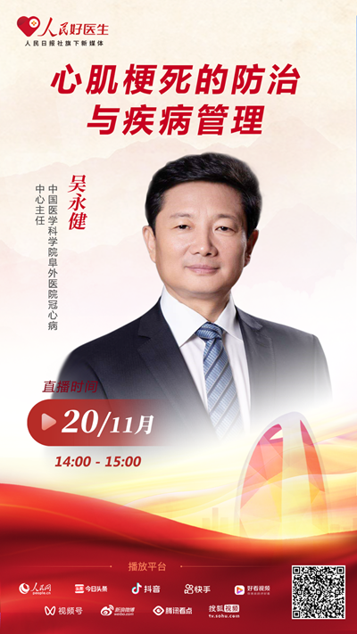 11月20日14:00-15:00,“人民好醫(yī)生”客戶端將邀請中國醫(yī)學(xué)科學(xué)院阜外醫(yī)院冠心病中心主任吳永健進(jìn)行視頻直播,為您科普心肌梗死診療及日常護(hù)理的相關(guān)知識,千萬不要錯過。