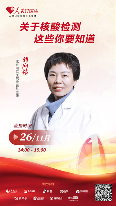 11月26日14:00,“人民好醫生”客戶端將邀請北京同仁醫院檢驗科主任劉向祎進行視頻直播,為您科普新冠核酸檢測的相關知識,千萬不要錯過。