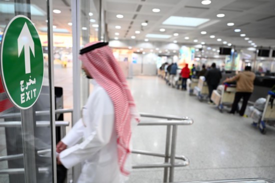 11月28日,在科威特費爾瓦尼耶省的科威特國際機場出發大廳,一名旅客辦理完登記手續準備登機。科威特政府27日宣布,將暫停與南非等9個非洲國家的商業直航航班,以防范南非等國近日報告的新冠病毒新型變異毒株輸入。新華社發(阿薩德攝)