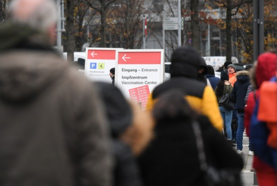 11月25日,在德國法蘭克福,人們在一處新冠疫苗中心外排隊等待接種疫苗。 新華社記者 逯陽 攝