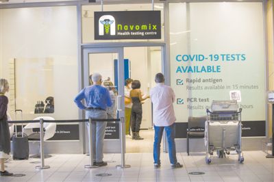 圖為11月29日,旅客在南非開(kāi)普敦國(guó)際機(jī)場(chǎng)等待接受新冠病毒檢測(cè)。