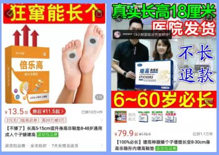 安徽消保委調查發現,這些增高產品雖然生產廠家不同、名稱和包裝各異,但無一例外都宣稱對增高有“奇效”,不僅“成年人可用”,而且“48歲以下還能長”,甚至連“老人都有希望”。在產品宣傳頁面,這些商家都展示了眾多“成功”增高案例。而很多噱頭十足的宣傳語也令人瞠目結舌。此外,不少產品頁面顯示其銷量可觀,頁面顯示不少拼單數都超過十萬件。