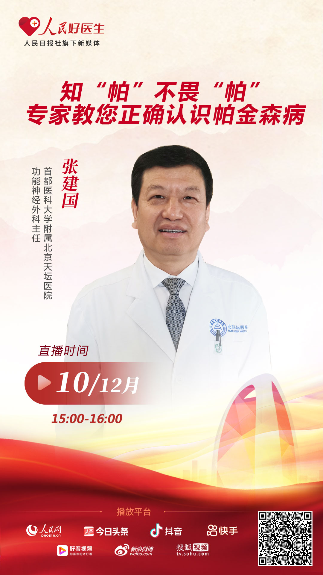 12月10日15:00,首都醫(yī)科大學附屬北京天壇醫(yī)院神經(jīng)外科中心副主任、功能神經(jīng)外科主任張建國教授將做客人民日報社旗下新媒體平臺“人民好醫(yī)生”客戶端直播間,與大家分享帕金森病的相關(guān)知識。歡迎屆時收看。