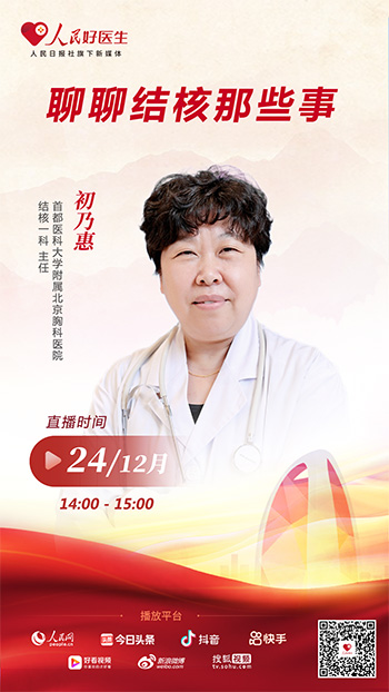 12月24日14:00,人民日報社旗下新媒體“人民好醫生”客戶端邀請首都醫科大學附屬北京胸科醫院結核一科主任初乃惠做客直播間,與大家“聊聊結核那些事”,歡迎屆時收看。