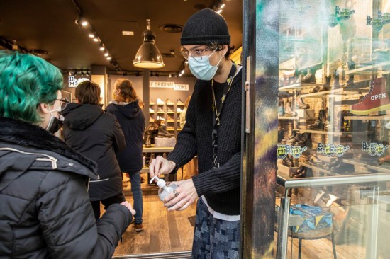 2021年12月22日,在法國北部城市里爾,商店店員為顧客提供消毒洗手液。(新華社發)