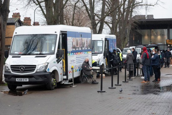 2021年12月6日,在英國倫敦,人們在新冠疫苗接種車旁排隊等待。(新華社發)