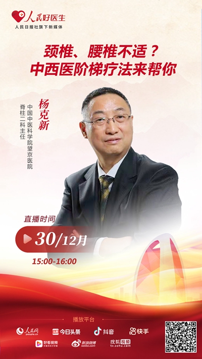 12月30日(周四)15:00-16:00,“人民好醫生”客戶端將邀請中國中醫科學院望京醫院脊柱二科主任楊克新進行視頻直播,為您科普頸椎、腰椎疾病診療的相關知識,千萬不要錯過。