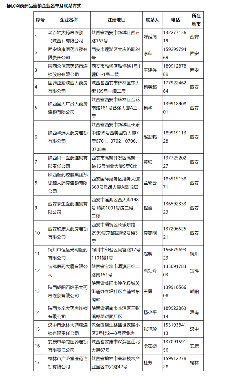 目前,西安市零售藥店、藥械批發企業均正常營業,為方便群眾購藥,省藥監局梳理出部分大型藥品連鎖企業名單,購藥人可致電咨詢,藥品零售連鎖總部將引導大家與就近下屬門店取得聯系,督促其下屬門店通過線上購買藥械并統一配送至小區物業處或封閉卡口點。