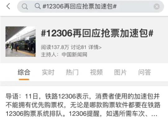 其實,此前鐵路12306就曾多次回應,消費者使用的加速包并不能擁有優先購票權,無論是哪款購票軟件都要在鐵路12306購票系統排隊。12306提醒,如遇到所需車次、席別無票,可在線排隊候補。當對應的車次、席別有退票時,系統將自動購買車票。
