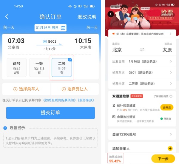 同一車次在鐵路12306可以正常購買,在某平臺上標注的搶票成功率為55.42%。制圖:記者喬業瓊