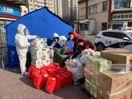 1月10日,在天津市津南區(qū)辛莊鎮(zhèn)林錦花園附近,物美超市工作人員為居民運送生活物資。新華社 發(fā)