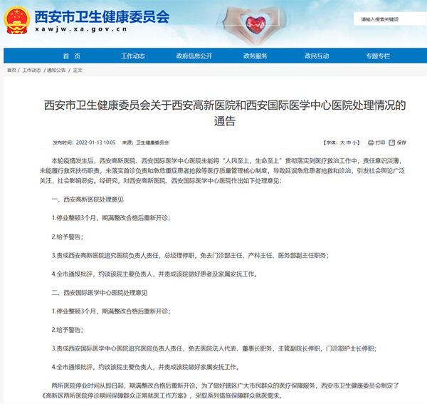 人民網北京1月13日電 (記者張文婷)西安市衛生健康委員官網今日發布《西安市衛生健康委員會關于西安高新醫院和西安國際醫學中心醫院處理情況的通告》(以下簡稱《通告》)。《通告》顯示,本輪疫情發生后,西安高新醫院、西安國際醫學中心醫院未能將“人民至上,生命至上”貫徹落實到醫療救治工作中,責任意識淡薄,未能履行救死扶傷職責,未落實首診負責和急危重癥患者搶救等醫療質量管理核心制度,導致延誤急危患者搶救和診治,引發社會輿論廣泛關注,社會影響惡劣。經研究,對西安高新醫院、西安國際醫學中心醫院作出如下處理意見: