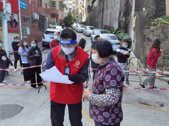 2022年1月8日,在深圳市龍崗區(qū)布吉街道布吉社區(qū)壹村東心嶺,黨員義工為居民提供服務(wù)。新華社發(fā)