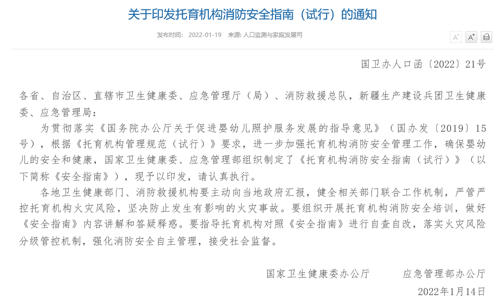 人民網(wǎng)北京1月20日電 (記者張文婷)為進(jìn)一步加強(qiáng)托育機(jī)構(gòu)消防安全管理工作,確保嬰幼兒的安全和健康,近日,國(guó)家衛(wèi)生健康委、應(yīng)急管理部組織制定了《托育機(jī)構(gòu)消防安全指南(試行)》(以下簡(jiǎn)稱(chēng)《安全指南》),要求托育機(jī)構(gòu)應(yīng)安裝24小時(shí)可視監(jiān)控設(shè)備或可視監(jiān)控系統(tǒng),圖像應(yīng)能在值班室、所在建筑消防控制室等場(chǎng)所實(shí)時(shí)顯示,視頻圖像信息保存期限不應(yīng)少于30天。