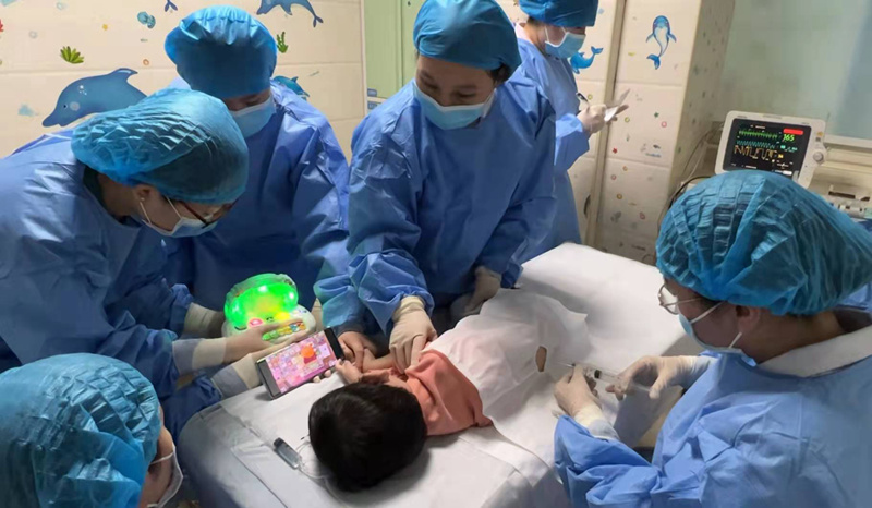 患兒在接受諾西那生鈉注射治療。河南省兒童醫院供圖