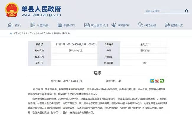 山東菏澤單縣通報“全村腦中風”事件。單縣人民政府官網截圖