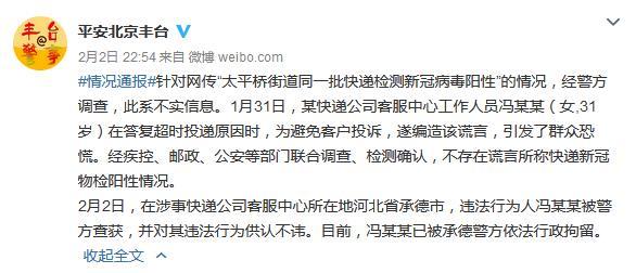 中新網2月3日電 據北京豐臺公安分局官方微博消息,針對網上流傳“太平橋街道同一批快遞檢測新冠病毒陽性”的情況,經警方調查,此系不實信息。1月31日,某快遞公司客服中心工作人員馮某某(女,31歲)在答復超時投遞原因時,為避免客戶投訴,遂編造該謊言,引發了群眾恐慌。經疾控、郵政、公安等部門聯合調查、檢測確認,不存在謊言所稱快遞新冠物檢陽性情況。
