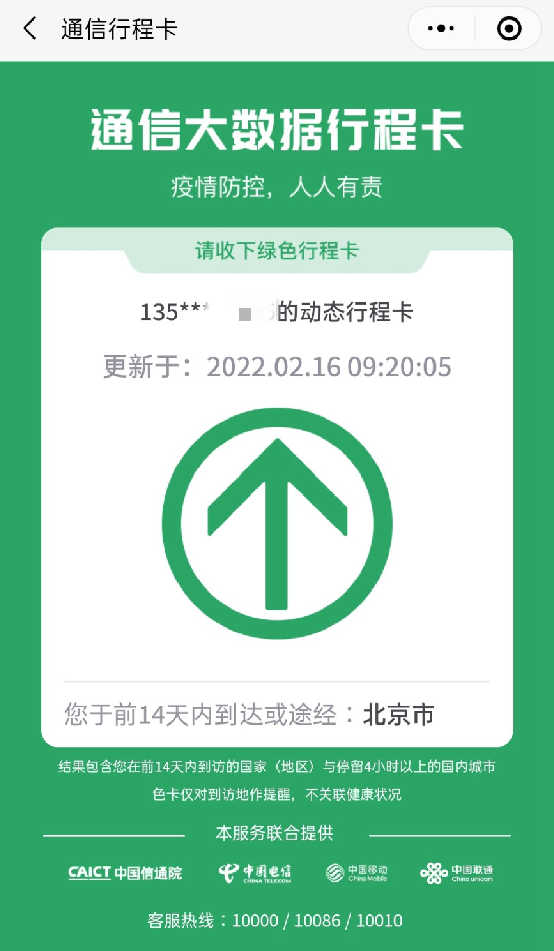 目前,通信行程卡顯示,北京市后的*(星號)已消失。