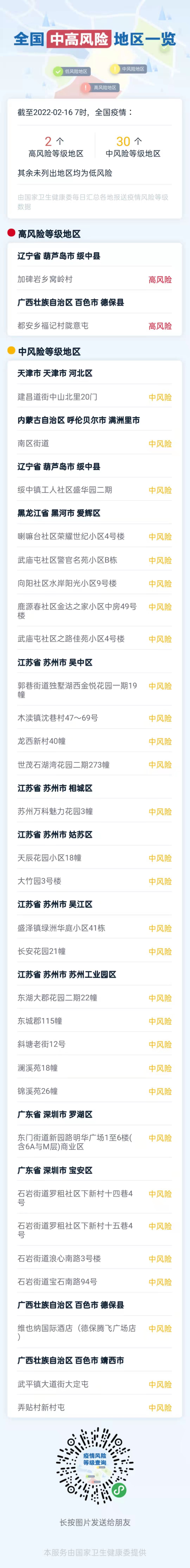 人民網北京2月16日電 (記者喬業瓊)截至2月16日7時,據國務院客戶端小程序顯示,北京最后一個中風險地區降級。至此,北京中風險地區清零,北京全市均為低風險地區!