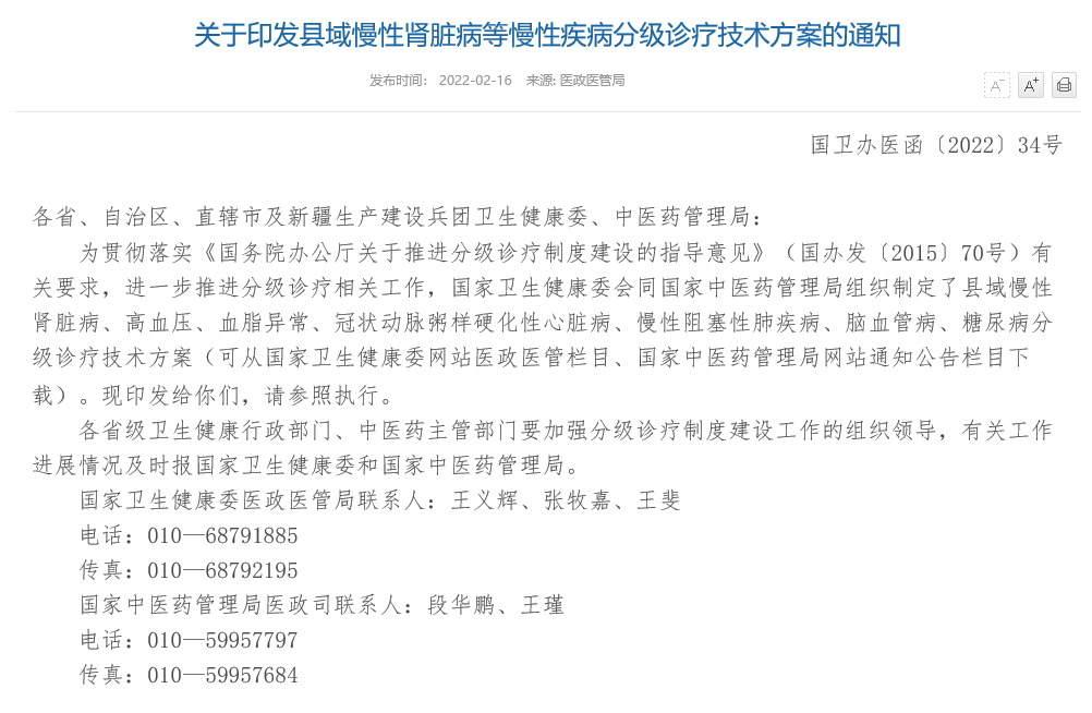 《通知》提到,為進一步推進分級診療相關工作,國家衛生健康委會同國家中醫藥管理局組織制定了縣域慢性腎臟病、高血壓、血脂異常、冠狀動脈粥樣硬化性心臟病、慢性阻塞性肺疾病、腦血管病、糖尿病七種慢性疾病分級診療技術方案。