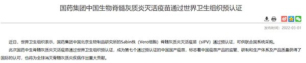 國家藥監局表示,此次國藥中生脊髓灰質炎滅活疫苗通過世界衛生組織預認證,成為第七個通過預認證的中國國產疫苗,標志著中國疫苗產品的監管、研制和生產體系及產品質量獲得了國際的認可,也將為全球消滅骨髓灰質炎疾病作出重大貢獻。