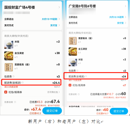 體驗人員分別通過新、老用戶兩個賬號同時在餓了么平臺訂購同一飯店的同樣飯菜,老用戶賬號不僅比新用戶賬號少了7元“雙重補貼”紅包,而且配送費也比新用戶少優惠0.4元。