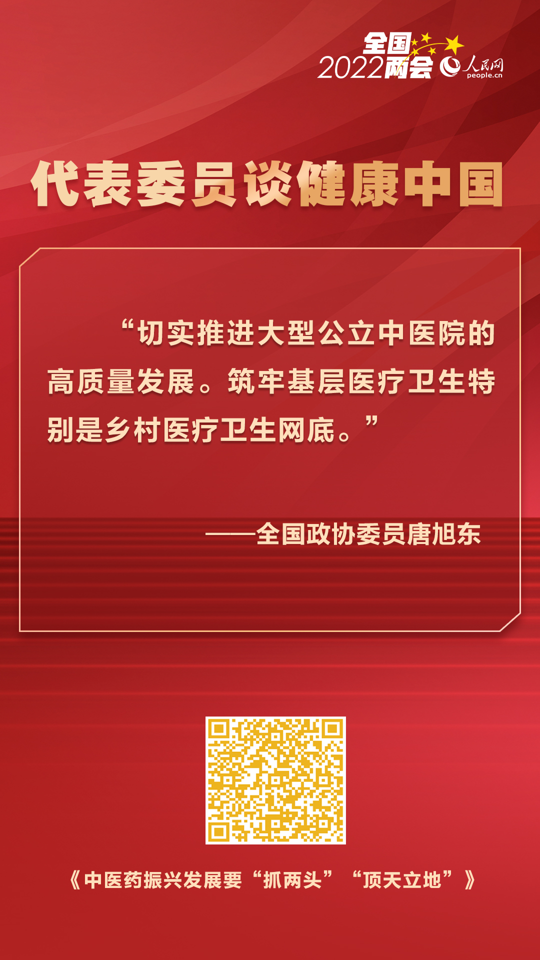 2022年是實施中醫藥振興發展重大工程的關鍵之年。對此,唐旭東提到,今年任務的重點是“抓兩頭”“頂天立地”,一是切實推進大型公立中醫院的高質量發展,真正發揮其在中醫藥醫療衛生服務行業的引領、推動作用;二是筑牢基層醫療衛生特別是鄉村醫療衛生的網底,促進健康保障小康,為鄉村振興戰略保駕護航。