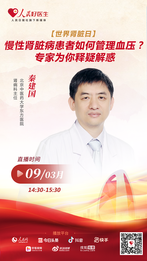 3月9日14:30,北京中醫藥大學東方醫院腎病科主任秦建國將做客人民日報社旗下新媒體平臺“人民好醫生”客戶端直播間,向廣大網友分享慢性腎臟疾病相關知識,歡迎屆時收看。