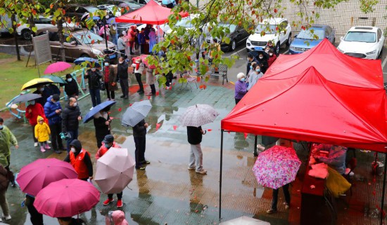 3月21日,在位于上海閔行的一個居民小區內,居民排隊進行核酸檢測采樣。新華社記者 方喆 攝