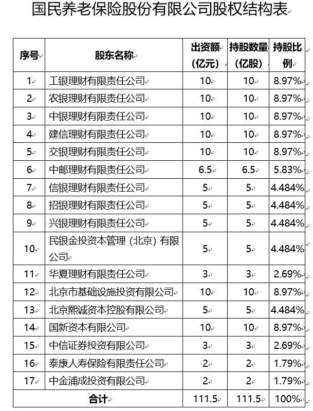 公告顯示,國民養老保險股份有限公司注冊資本為人民幣111.5億元,發起人分別為,工銀理財、農銀理財、中銀理財、建信理財、交銀理財各投資10億元,持股比例均為8.97%;中郵理財投資6.5億元,持股比例5.83%;信銀理財、招銀理財、興銀理財、民銀金投資本管理(北京)有限公司各投資5億元,持股比例同為4.48%;華夏理財投資3億元、持股2.69%;北京市基礎設施投資有限公司投資10億元,持股8.97%;北京熙誠資本控股有限公司出資5億元,持股4.48%;國新資本出資10億元,持股8.97%;中信證券投資有限公司出資3億元,持股2.69%;泰康人壽投資2億元,持股1.79%;中金浦成投資有限公司出資2億元,持股1.79%。
