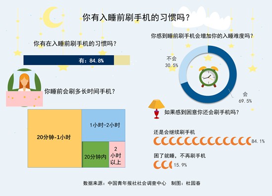 上周,中國青年報社社會調查中心聯合問卷網(wenjuan.com),對1532名受訪青年進行的一項調查顯示,84.8%的受訪青年都有睡前刷手機的習慣。即便感到困意,84.1%的受訪青年還是會繼續刷手機。69.5%的受訪青年直言睡前刷手機會增加入睡難度。