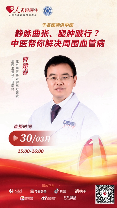 3月30日15:00至16:00,人民日報社旗下新媒體平臺“人民好醫生”與國家中醫藥管理局辦公室聯合推出的“千名醫師講中醫”系列直播將邀請北京中醫藥大學東方醫院周圍血管科曹建春主任醫師做客直播間,為大家詳細講解中醫如何認識和應對周圍血管疾病。